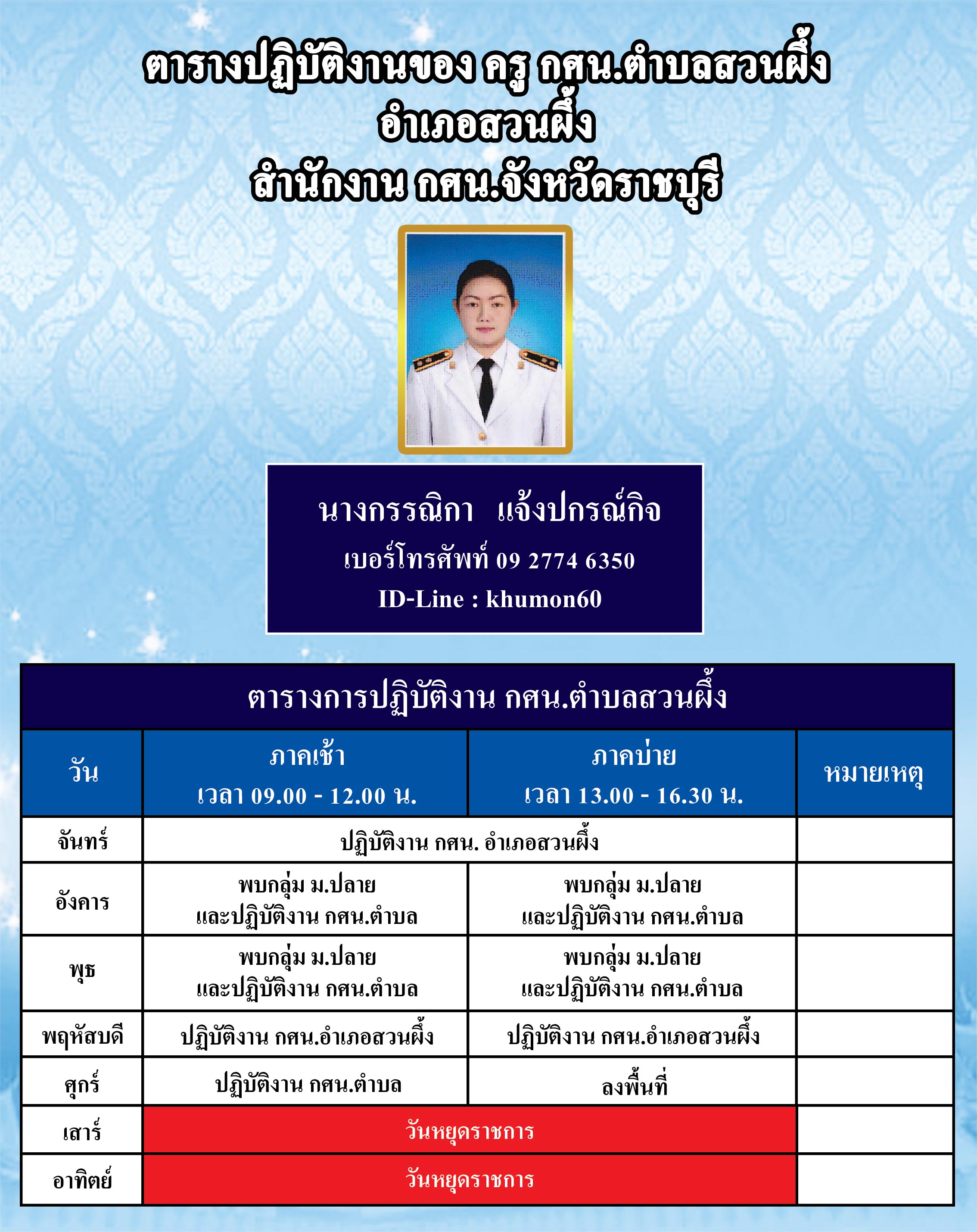 ตารางปฎิบัติงานของครู กศน.ตำบลสวนผึ้ง
